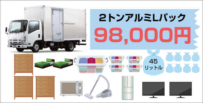 〜1DKの不用品回収なら2tトラック車積み放題パック!軽トラでは乗り切らない分も2t車なら楽々搭載可能。