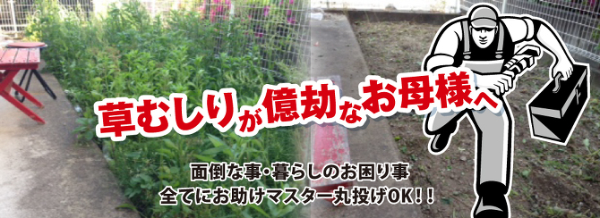 70代女性:庭の草刈り庭の草むしりは体力のいる作業です。年々、年を重ねると億劫に感じるようになった庭の手入れ。今年は誰かにしてもらいたいなと思っていたら孫が便利屋お助けマスターさんのことを教えてくれたので、依頼しました。とても親切で、丁寧に作業してくれたので、こちらの気分も晴れやかになりました。またお願いします。